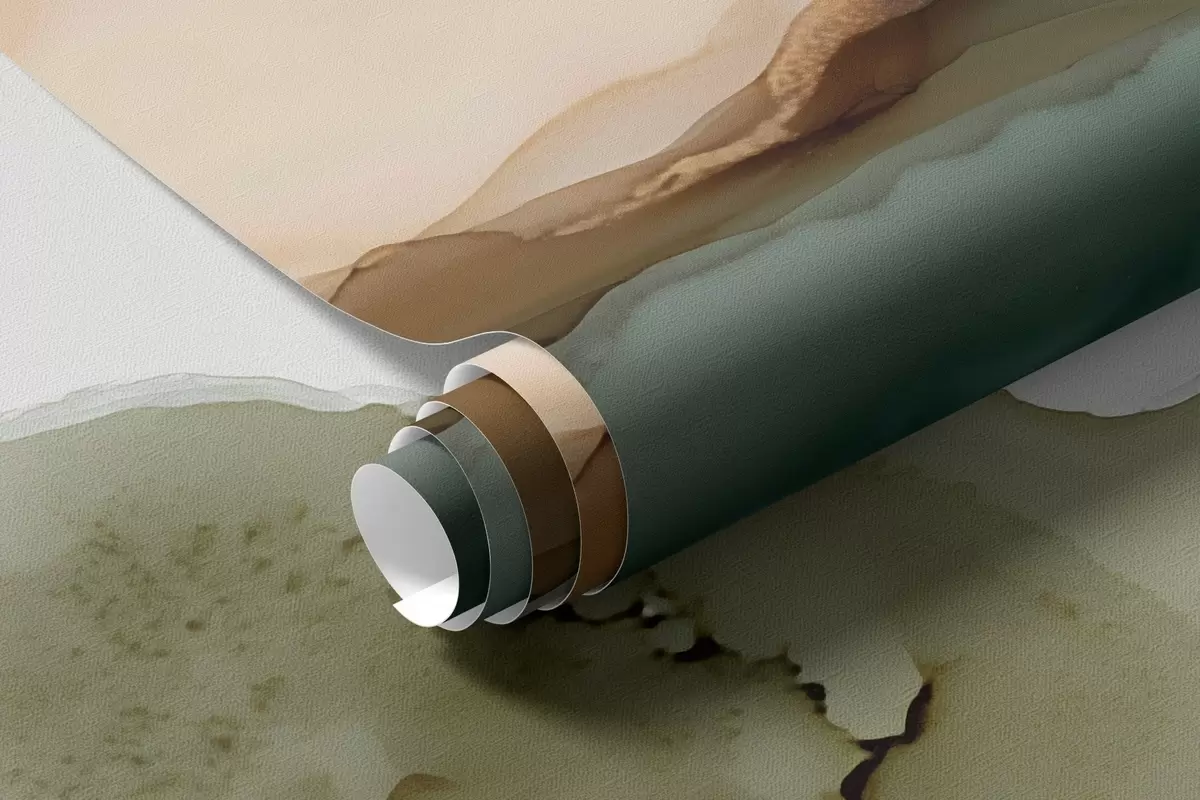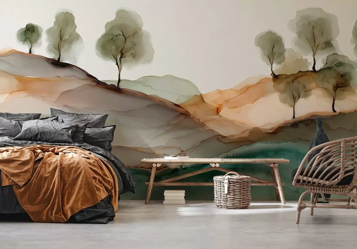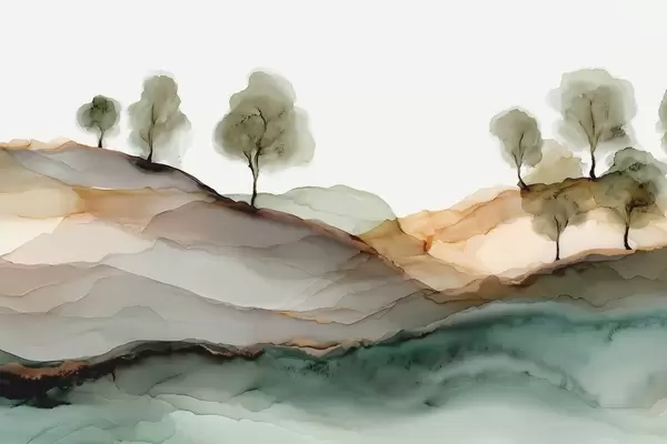 Fototapetai Abstraktus peizažas alkoholinių dažų stiliumi — kalvos ir medžiai pastelinėmis spalvomis Nr. w09457