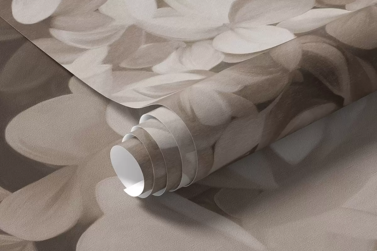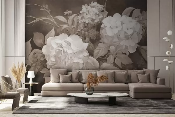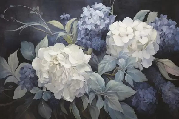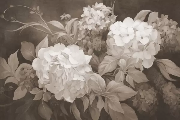 Fototapetai Tekstūruotas sepijos dažais tapytas hortenzijų žiedų su dideliais lapais imitacija, abstraktus ir tamsus fonas Nr. w09465
