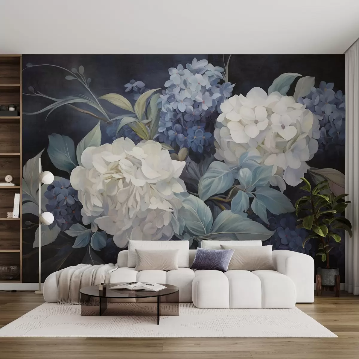 Fototapetai Tekstūruotas tamsiai mėlynas paveikslas, imituojantis hortenzijų žiedus su dideliais lapais, abstraktus ir tamsus fonas Nr. w09465v1