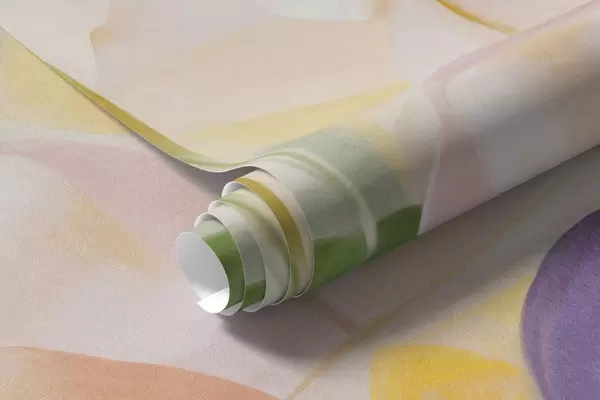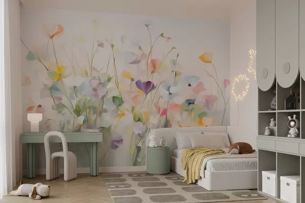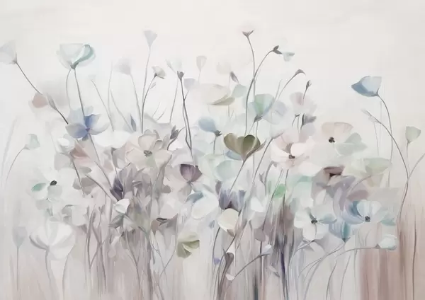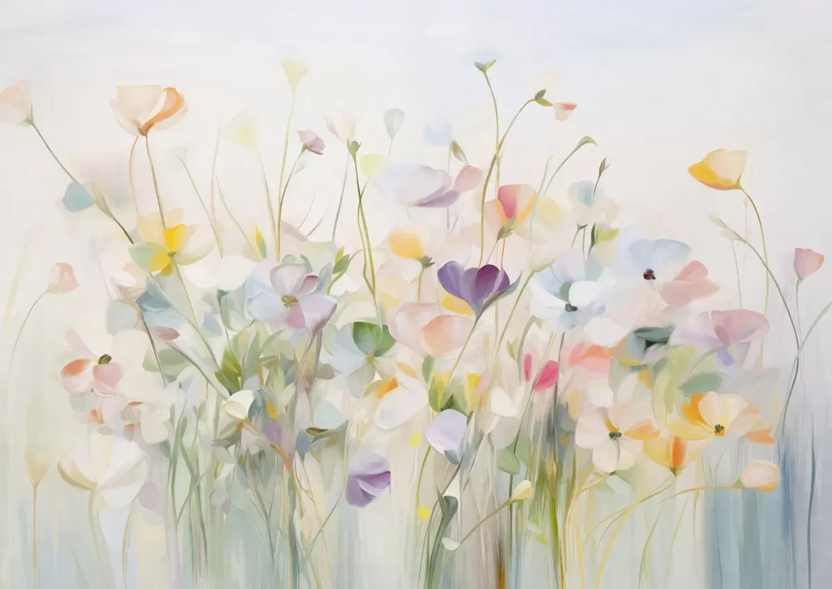 Fototapetai Abstraktus spalvingų gėlių su ilgais stiebais ir žaliais lapais laukas, tekstūruotas, pastelinės, šviesios spalvos Nr. w09466