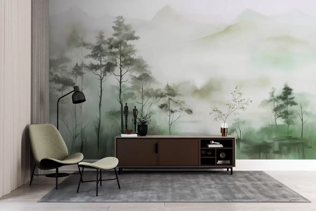 Fototapetai Rūko apgaubtas kraštovaizdis su aukštais medžiais ir kalnais, neryškiais žaliais ir pilkais atspalviais, minimalistinis stilius, tekstūruotas Nr. w09469