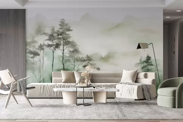 Fototapetai Rūko apgaubtas kraštovaizdis su aukštais medžiais ir kalnais, neryškiais žaliais ir pilkais atspalviais, minimalistinis stilius, tekstūruotas Nr. w09469