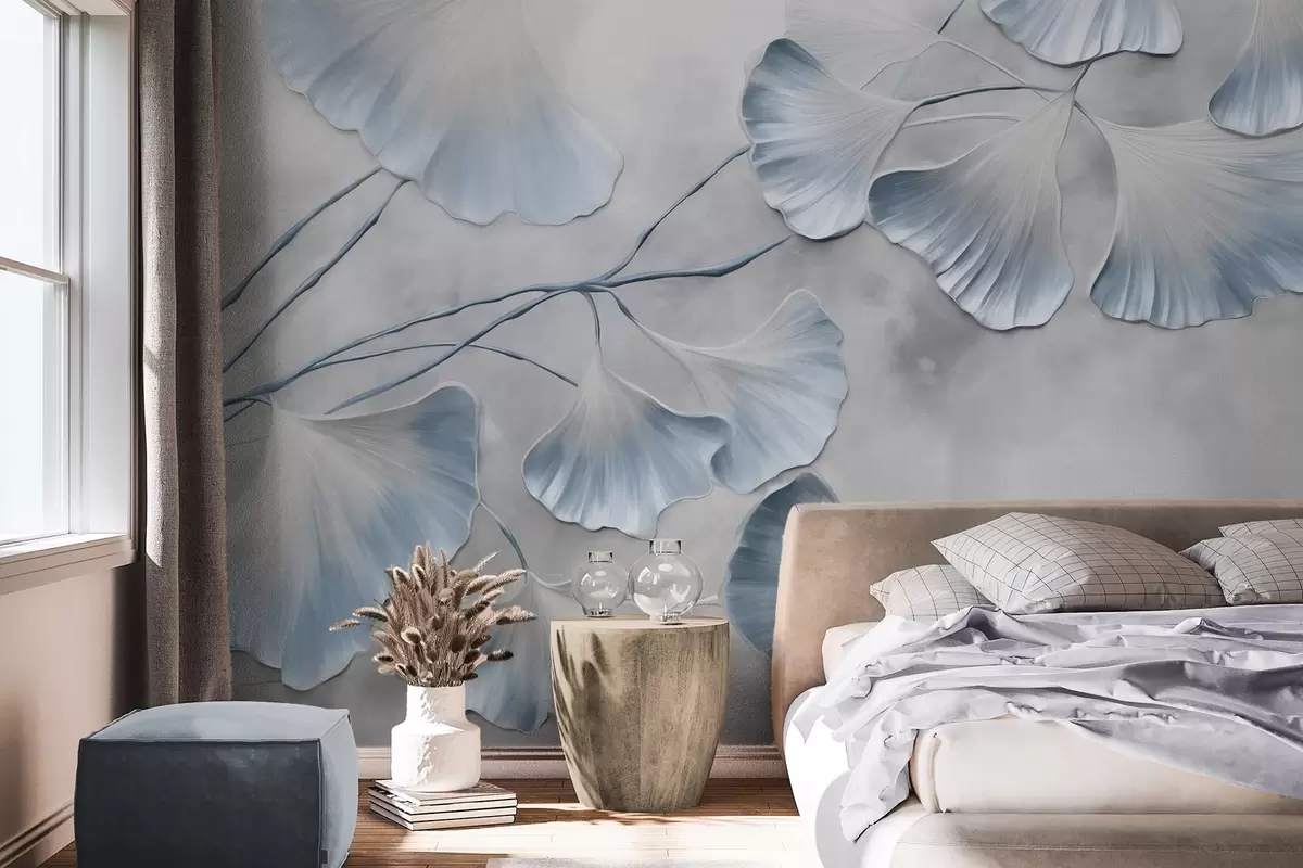 Fototapetai Ginkgo biloba lapai su mėlynais kraštais ant šakos, pilkos tekstūros fonas, elegantiškas ir minimalistinis dizainas Nr. w09472v1