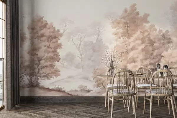 Fototapetai Tekstūruotas peizažo tapybos imitacija miško su aukštais medžiais ir žole, prislopintos ir švelnios spalvos, raminantis vaizdas Nr. w09474