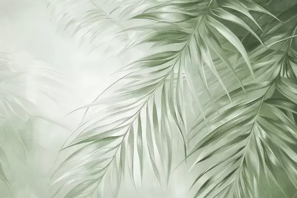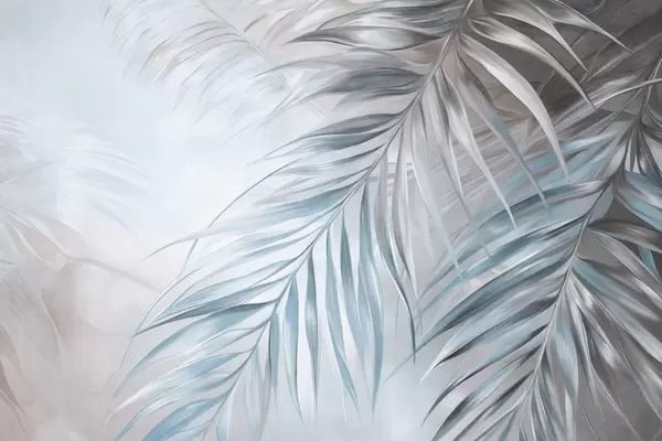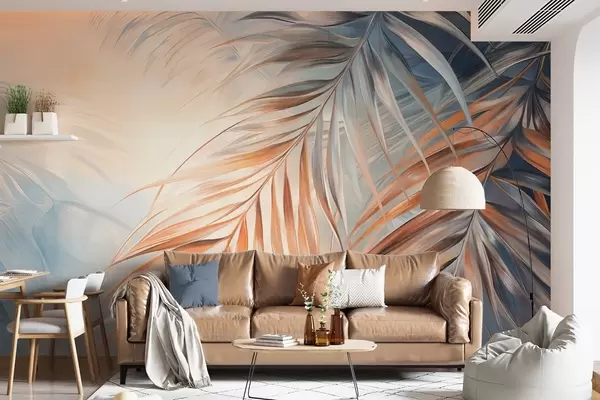 Fototapetai Palmių lapai su oranžiniais ir mėlynais atspalviais, šviesus tekstūruotas fonas su švelniomis spalvomis, elegantiškas tropinis stilius Nr. w09475