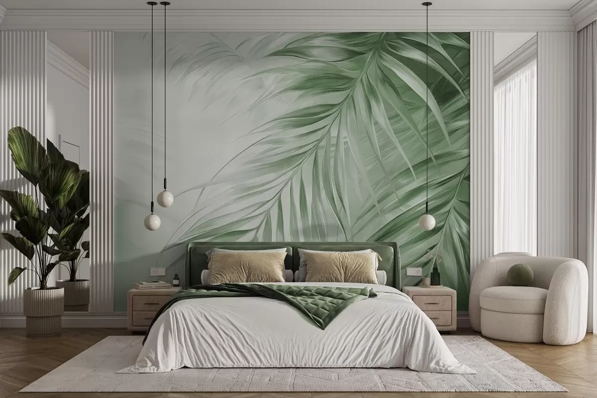Fototapetai Žalios spalvos palmių lapai, šviesus tekstūruotas fonas su švelniomis spalvomis, elegantiškas tropinis stilius Nr. w09475v2