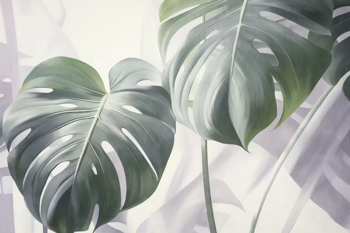 Fototapetai Tekstūruoti monstera lapai, dideli ir žali, ant švelnaus, šviesaus abstraktaus fono Nr. w09477
