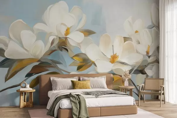 Fototapetai Balta magnolija su žaliais lapais ant šviesiai mėlyno fono su abstrakčiais potėpiais Nr. w09478