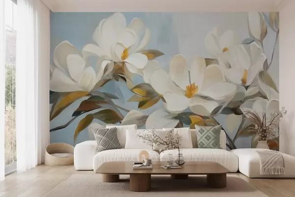 Fototapetai Balta magnolija su žaliais lapais ant šviesiai mėlyno fono su abstrakčiais potėpiais Nr. w09478