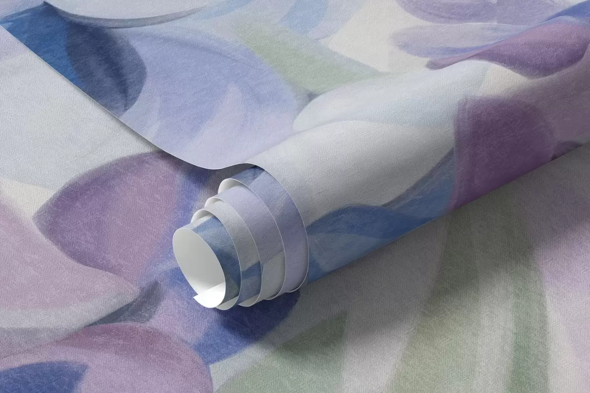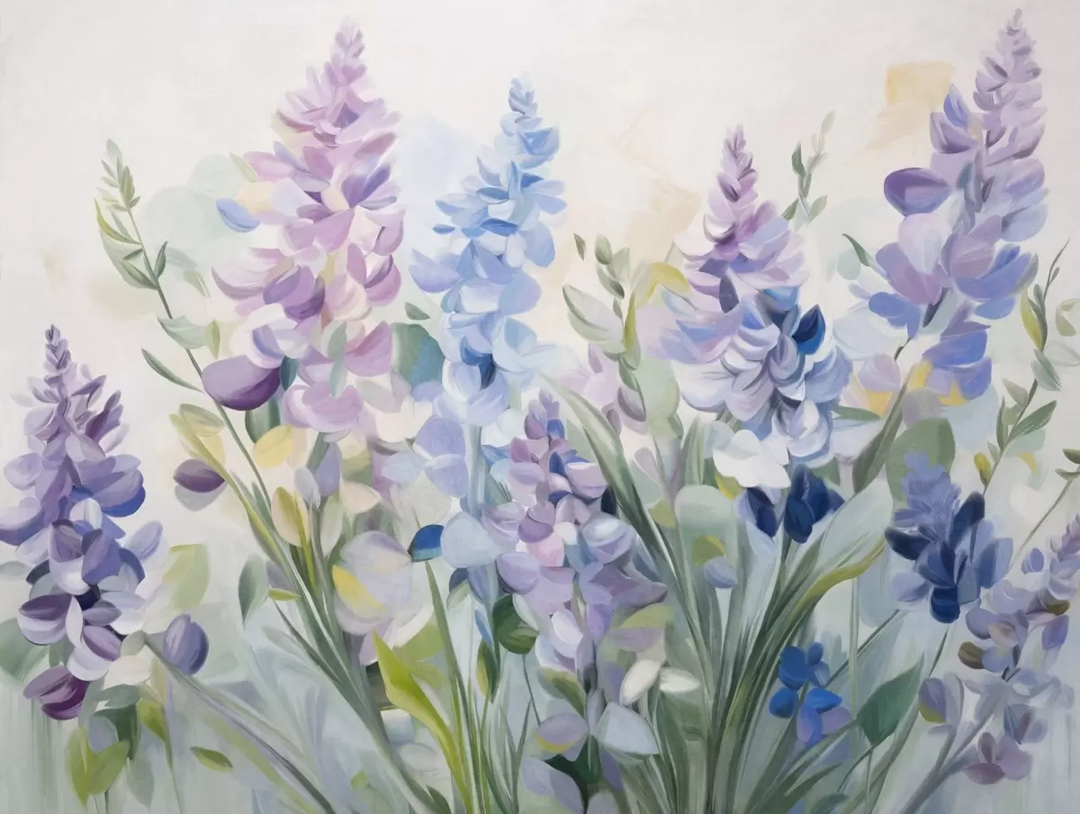 Fototapetai Violetinės ir mėlynos tekstūruotos gėlės su mėlynais lapais, šviesus fonas, švelnūs teptuko potėpiai, ryškūs spalvos Nr. w09482