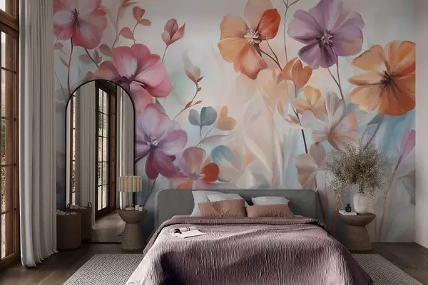 Fototapetai Tekstūrinė gėlių kompozicija su rožiniais, violetiniais ir oranžiniais žiedais, žaliais stiebais ir lapais, švelniomis pastelinėmis spalvomis Nr. w09486