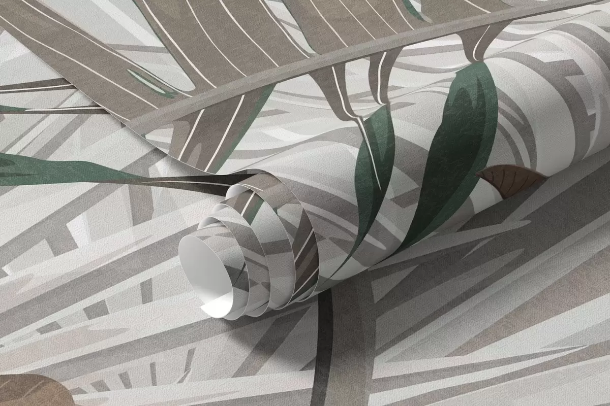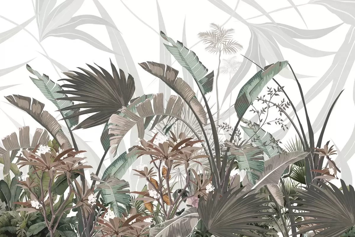 Fototapetai Tropiniai tekstūruoti lapai su gėlėmis, palmių medžiai, plumeria gėlės, pastelinės spalvos, baltas fonas, džiunglės Nr. w09488