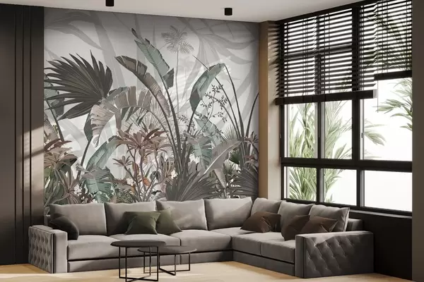 Fototapetai Tropiniai tekstūruoti lapai su gėlėmis, palmių medžiai, plumeria gėlės, pastelinės spalvos, baltas fonas, džiunglės Nr. w09488