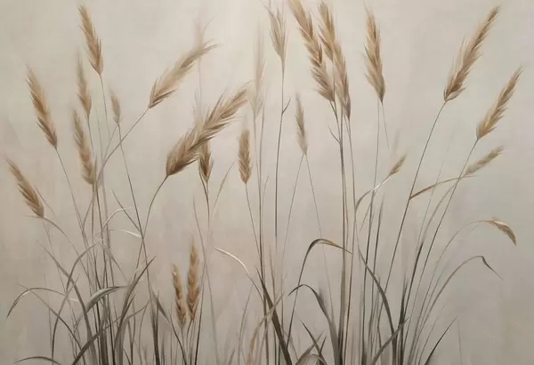 Fototapetai Kviečių tekstūruotas laukas su geltonomis varpomis, smėlio spalvos fonas, natūralus apšvietimas, šilti tonai, detalūs potėpiai Nr. w09493