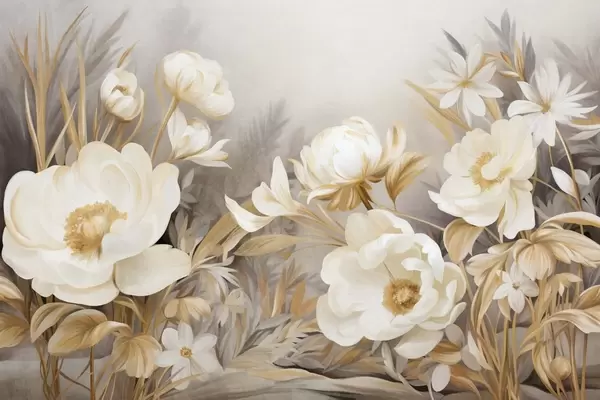 Fototapetai Balta ir geltona bijūnai bei kiti gėlės su aukšta žole ir lapais, tapybos stiliaus tekstūra Nr. w09494