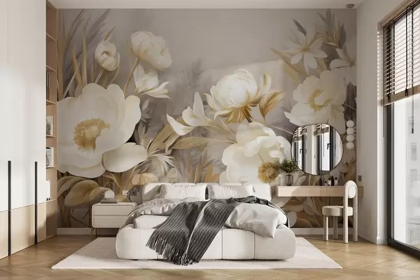 Fototapetai Balta ir geltona bijūnai bei kiti gėlės su aukšta žole ir lapais, tapybos stiliaus tekstūra Nr. w09494