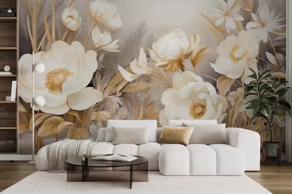 Fototapetai Balta ir geltona bijūnai bei kiti gėlės su aukšta žole ir lapais, tapybos stiliaus tekstūra Nr. w09494