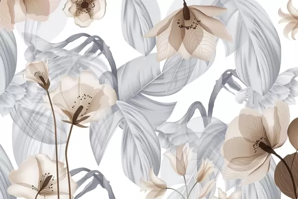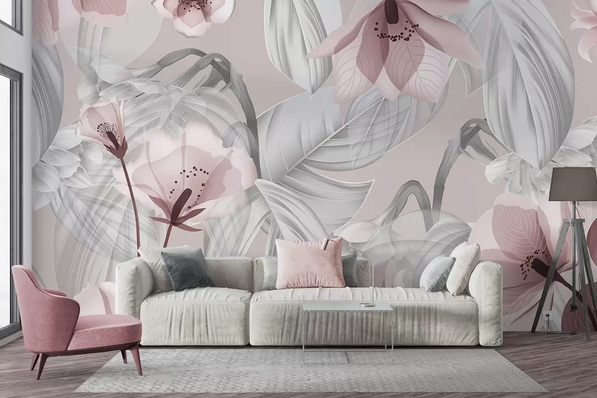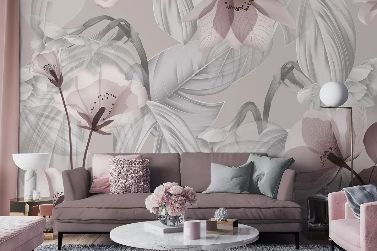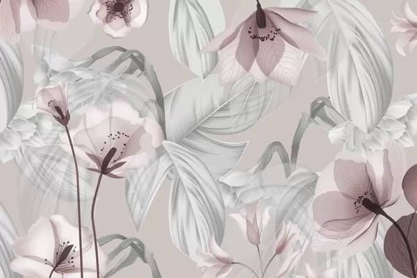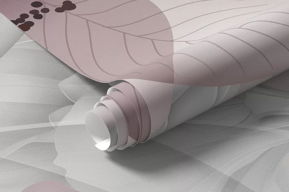 Fototapetai Rožinės gėlės ir pilkos lapai, gėlių botaninis fonas, elegantiškas dizainas, švelnios spalvos, lengvos subtilios detalės Nr. w09497