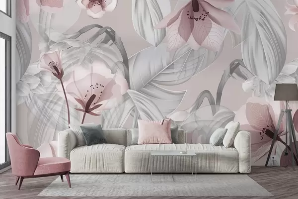 Fototapetai Rožinės gėlės ir pilkos lapai, gėlių botaninis fonas, elegantiškas dizainas, švelnios spalvos, lengvos subtilios detalės w09497