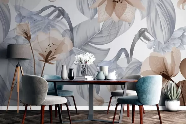 Fototapetai Rudos gėlės ir pilkos lapai, gėlių botaninis fonas, elegantiškas dizainas, švelnios spalvos, lengvos subtilios detalės Nr. w09497v1
