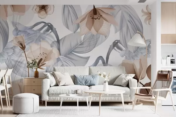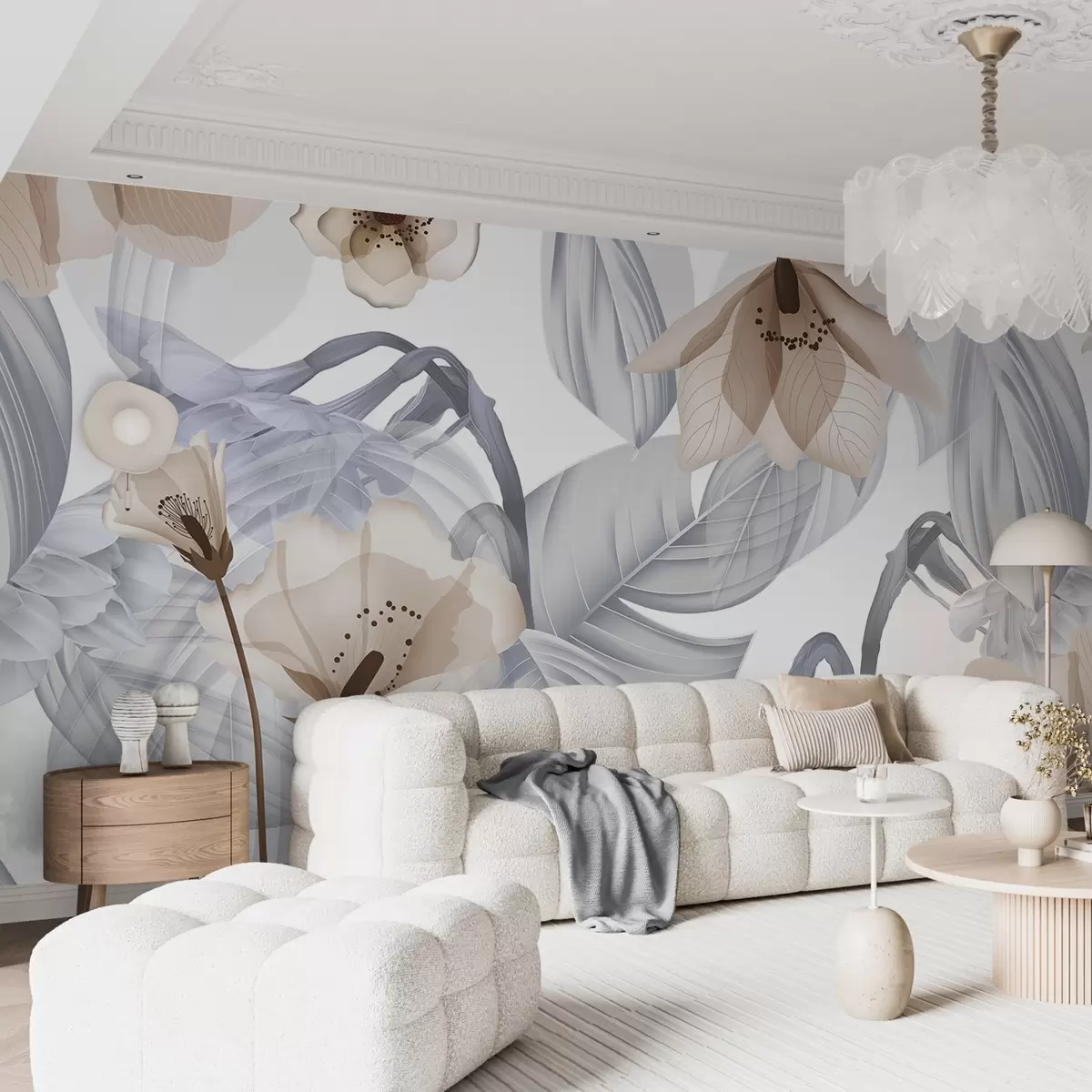 Fototapetai Rudos gėlės ir pilkos lapai, gėlių botaninis fonas, elegantiškas dizainas, švelnios spalvos, lengvos subtilios detalės Nr. w09497v1