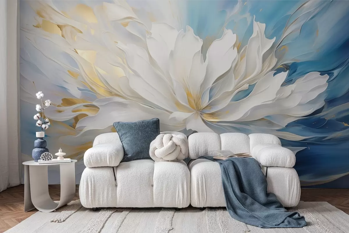 Fototapetai Didelė balta bijūnė aliejaus tapybos stiliumi mėlynos-geltonos spalvos fone Nr. w09511