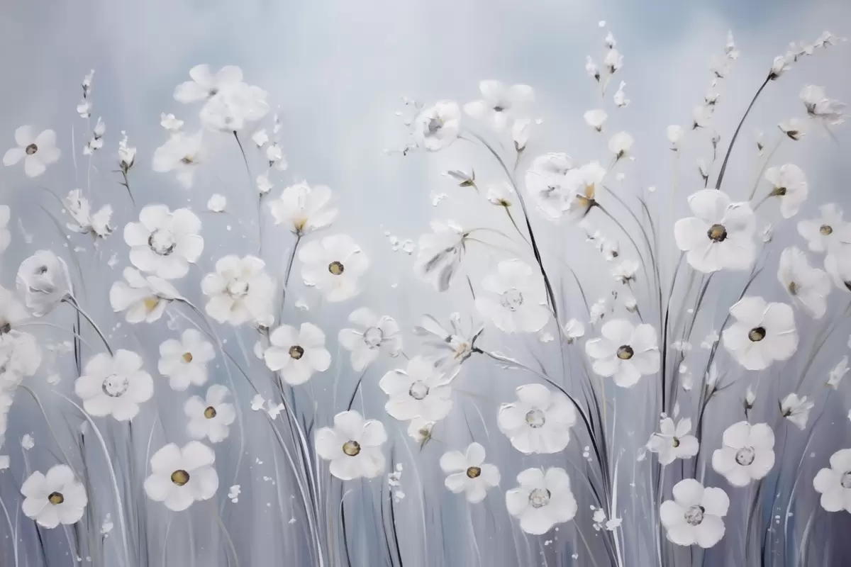 Fototapetai Balta gėlė prieš mėlyną kalną ir ežerą, tapyta aliejiniais dažais Nr. w09516