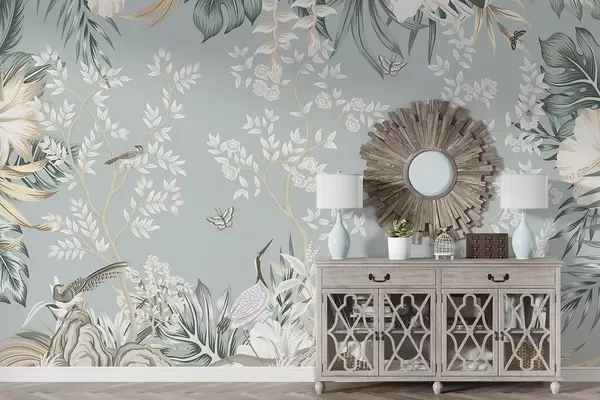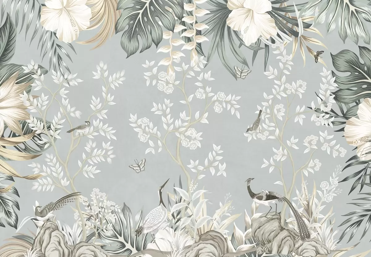 Fototapetai Tropinis tekstūruotas pastelės meno kūrinys su paukščiais, drugeliais, hibiskų žiedais, palmių lapais ir medžiais šviesiai mėlyname fone. Nr. w09528