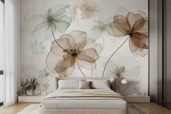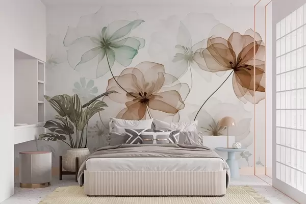 Fototapetai Permatomi gėlės su rudais ir žaliais žiedlapiais, ilgais stiebais, šviesiu fonu, švelniomis spalvomis, tekstūruotu gėlių dizainu Nr. w09529