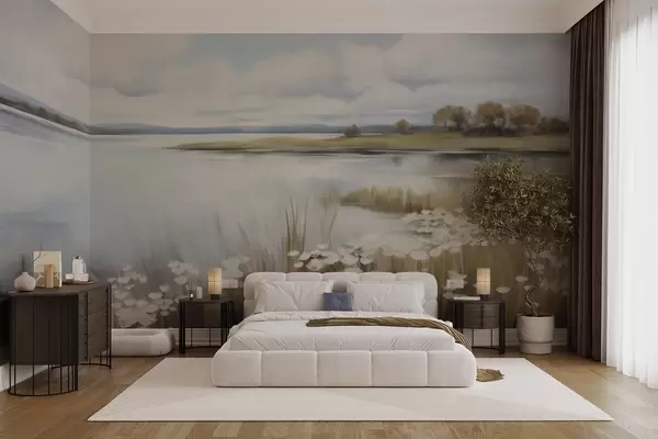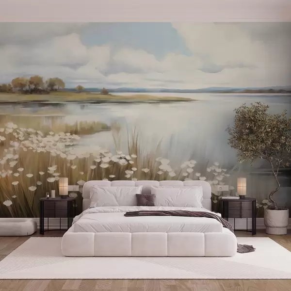 Fototapetai Tekstūruotas kraštovaizdis, baltais žiedais ir aukšta žole apsodintas laukas, ežeras fone, žolėtas kalnas su medžiais, švelnios spalvos Nr. w09530
