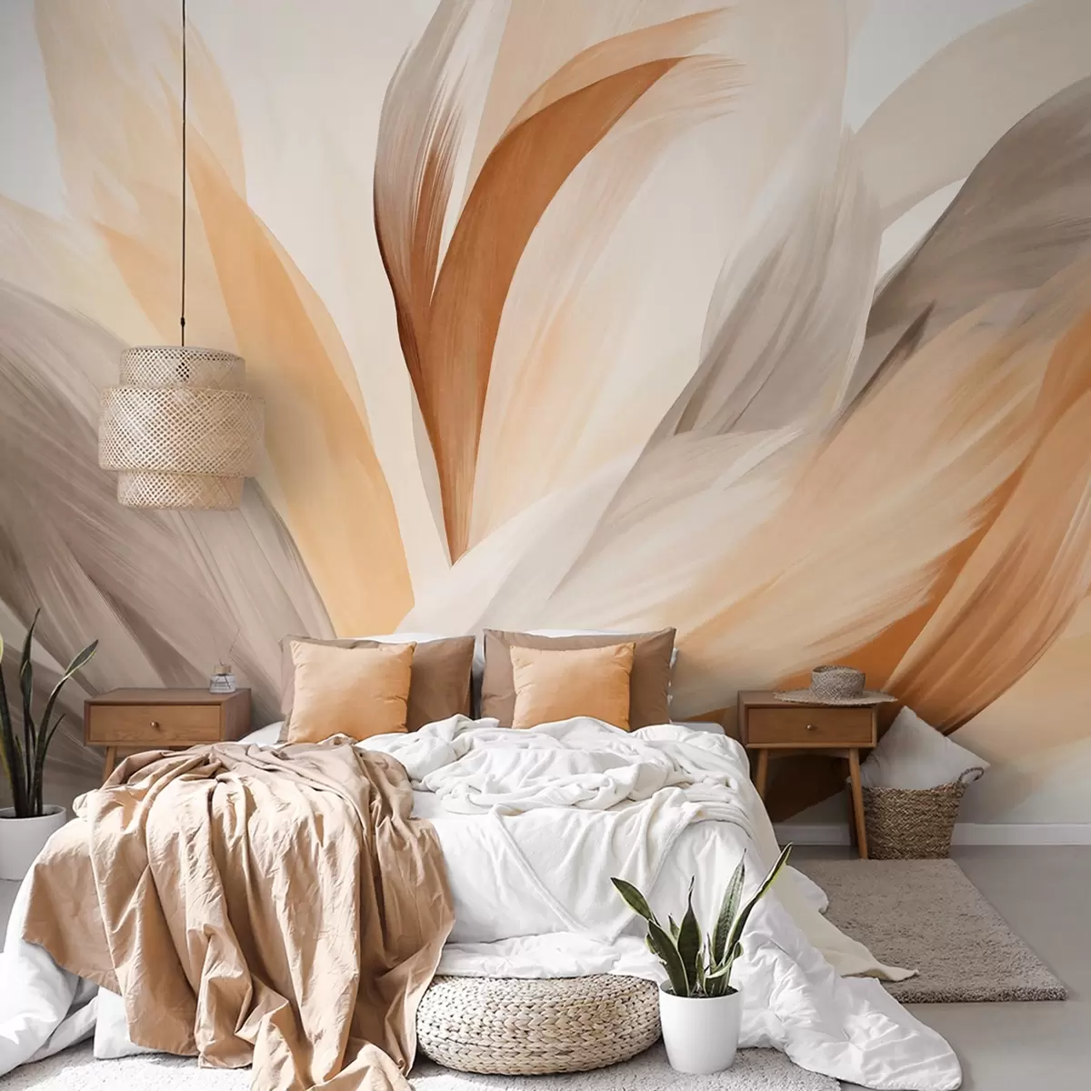 Fototapetai Abstrakčios tekstūruotos plunksnos rudos, baltos, pilkos ir įvairių atspalvių, persidengiančios ant balto fono Nr. w09531