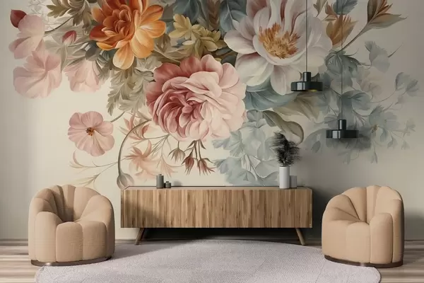 Fototapetai Vintage gėlių kompozicija su rožėmis, bijūnais ir kitomis tekstūrinėmis gėlėmis su lapija, ant šviesaus fono Nr. w09532