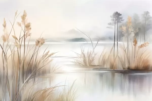 Fototapetai Pejzažas su ežeru ir aukšta žole priešakyje, kalnai fone, švelnios spalvos, tekstūruotas Nr. w09534
