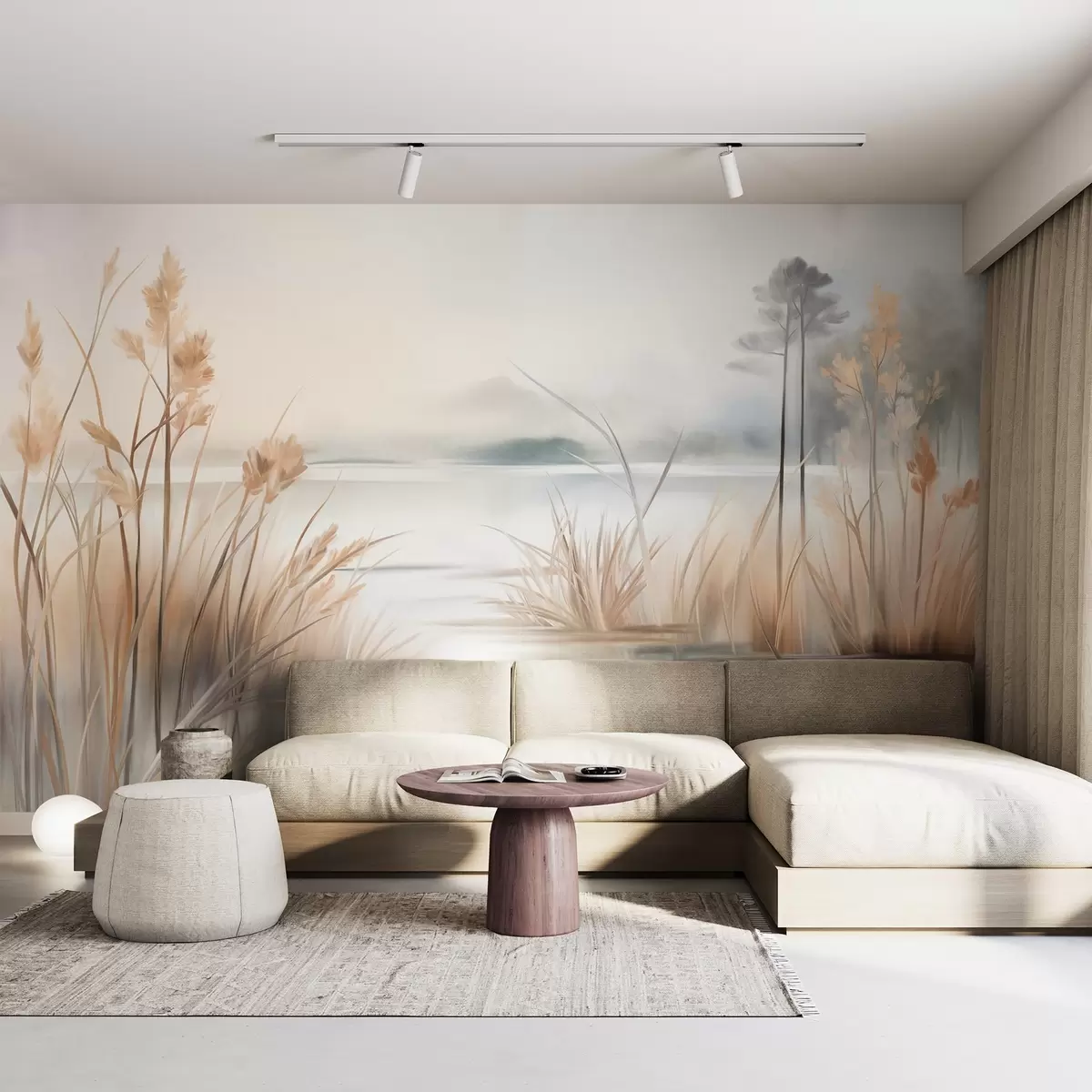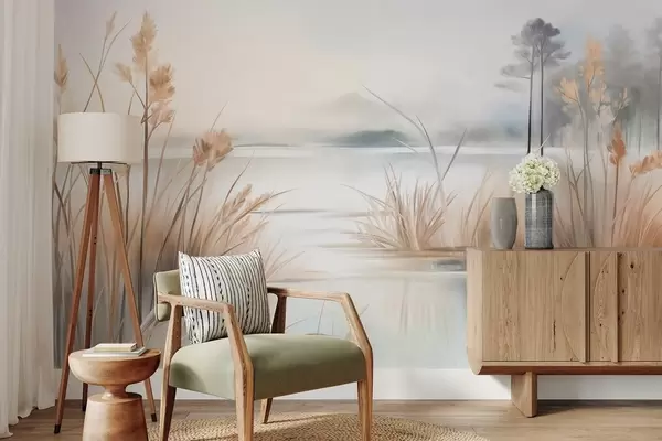 Fototapetai Pejzažas su ežeru ir aukšta žole priešakyje, kalnai fone, švelnios spalvos, tekstūruotas Nr. w09534