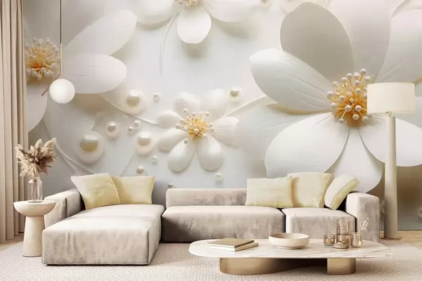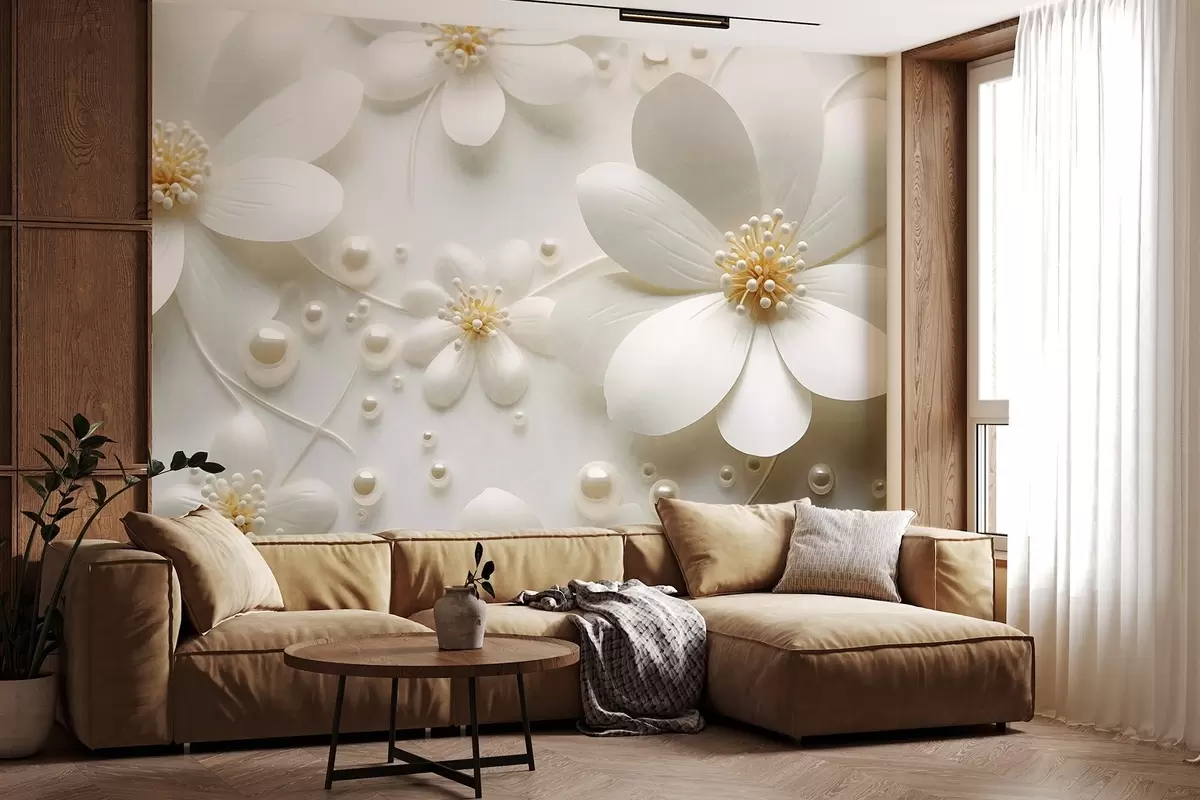 Fototapetai Balta gėlė su perlų taškeliais ant balto fono, elegantiškas ir minimalistinis dizainas, tekstūruotas Nr. w09535