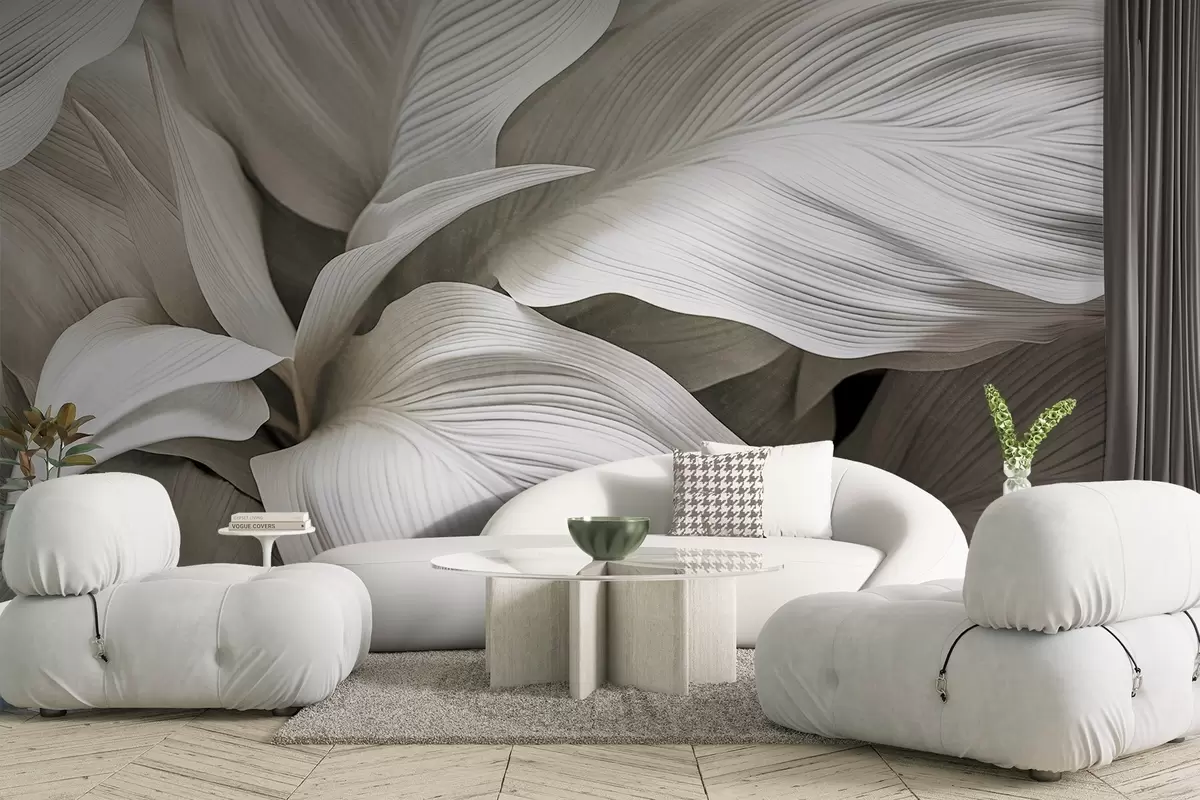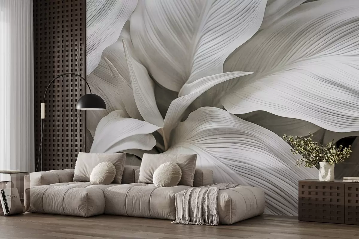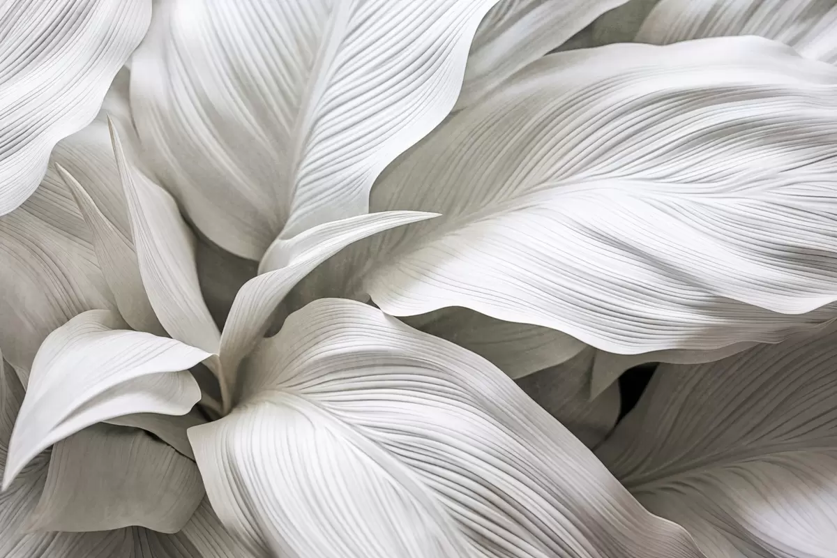 Fototapetai Didelės, tekstūruotos baltos lapai su ryškiais gyslomis, persidengiančios ir sukuriančios gylį Nr. w09536