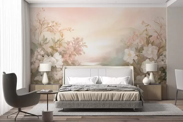 Fototapetai Peizažas su upeliu, apsuptu gėlėmis ir augalais, švelniomis spalvomis, rausvu dangumi, akvarelės tekstūros stiliumi Nr. w09537
