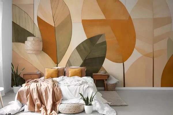 Fototapetai Abstrakčios didelės lapų formos figūros oranžinės, rudos ir žalios spalvų, tekstūruotos, išdėstytos ant šviesaus fono Nr. w09539