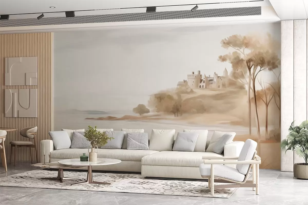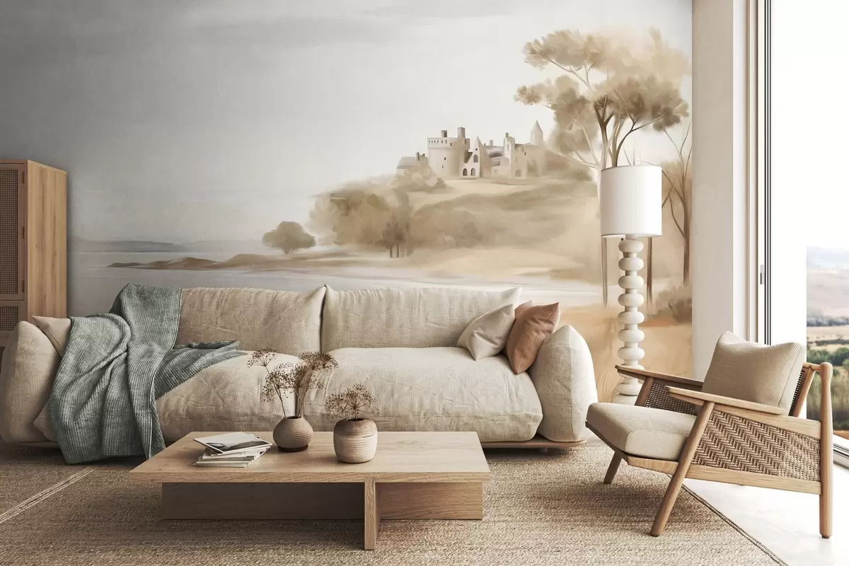 Fototapetai Pejzažas su pilimi ant kalvos prie jūros, smėlio paplūdimys pirmame plane, prislopintos spalvos, tekstūruotas menas Nr. w09540