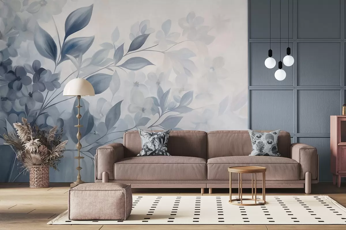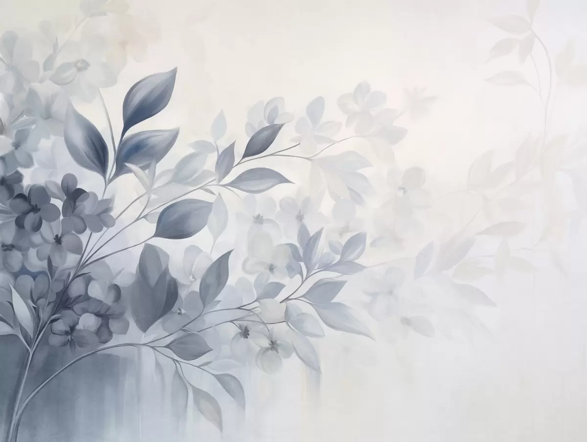 Fototapetai Tekstūruota mėlyna ir balta šaka su gėlėmis ir lapais, išblėstančiais į šviesų foną, tapybos stiliumi Nr. w09543
