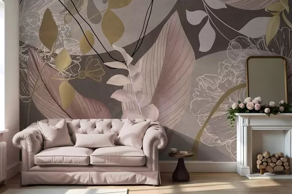 Fototapetai Abstraktus gėlių raštas su dideliais lapais švelnių rožinių ir rudų atspalvių, su plonomis juodomis linijomis ir baltomis gėlių kontūromis Nr. w09544
