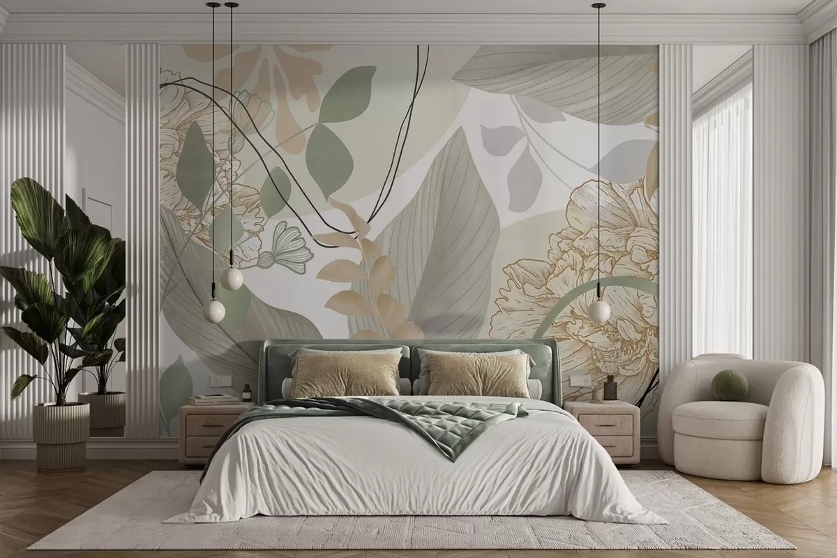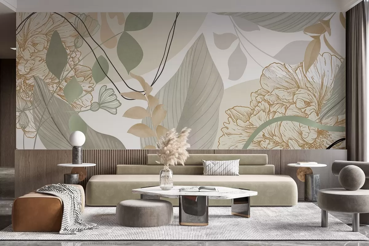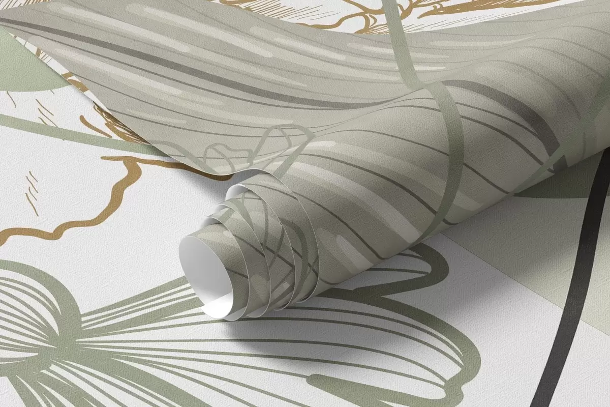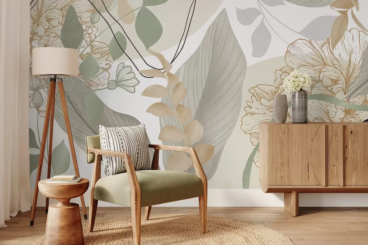 Fototapetai Abstraktus gėlių raštas su dideliais lapais, atspalvių nuo prislopintos žalios iki geltonos, su plonomis juodomis linijomis ir baltomis gėlių kontūromis. Nr. w09544v2