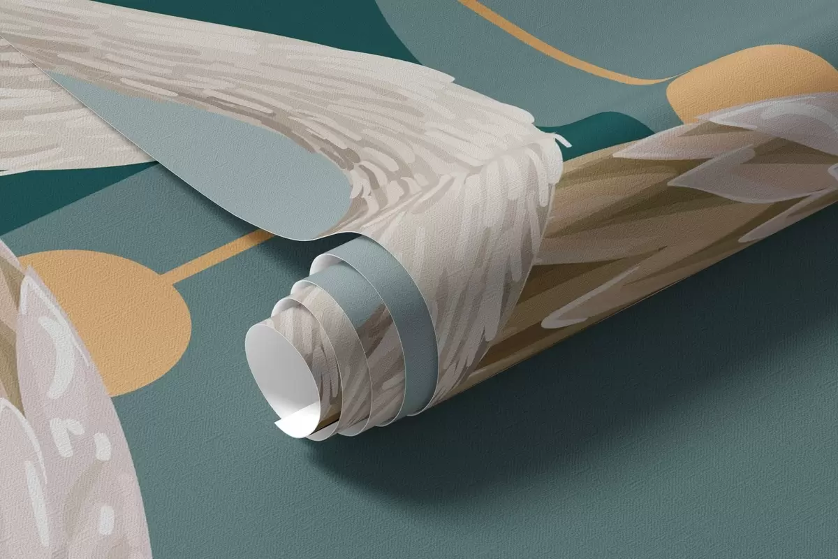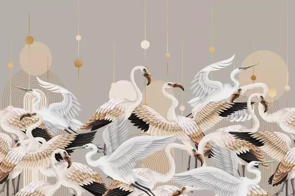 Fototapetai Baltojo flamingo pulkas su subtiliais sparnais, tamsiai žalios spalvos fone su geltonomis linijomis ir apskritimais Nr. w09546