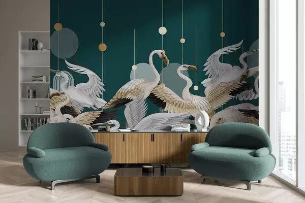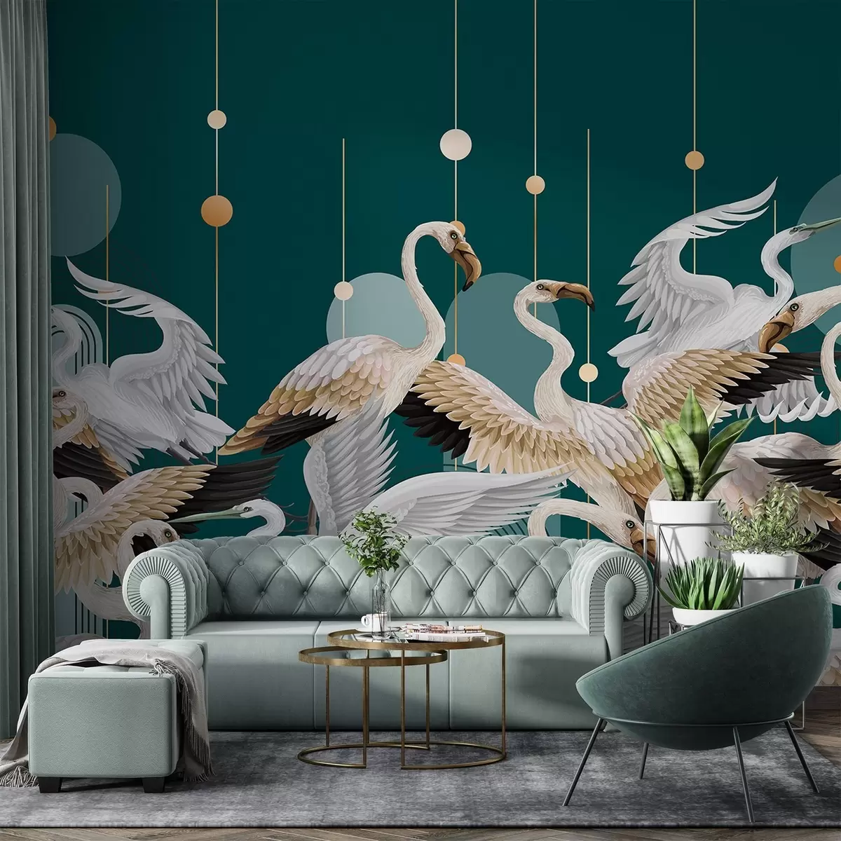Fototapetai Baltojo flamingo pulkas su subtiliais sparnais, tamsiai žalios spalvos fone su geltonomis linijomis ir apskritimais Nr. w09546