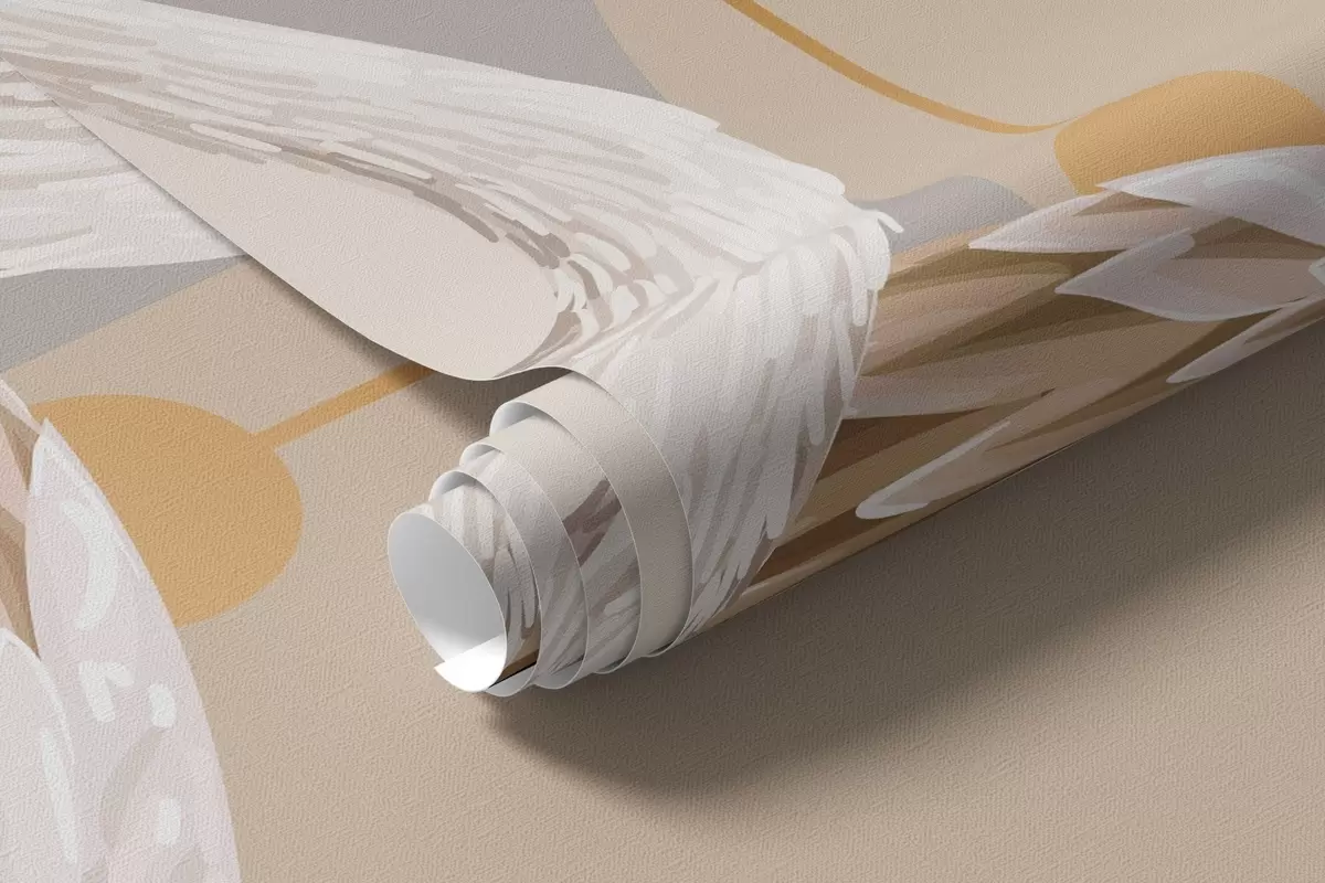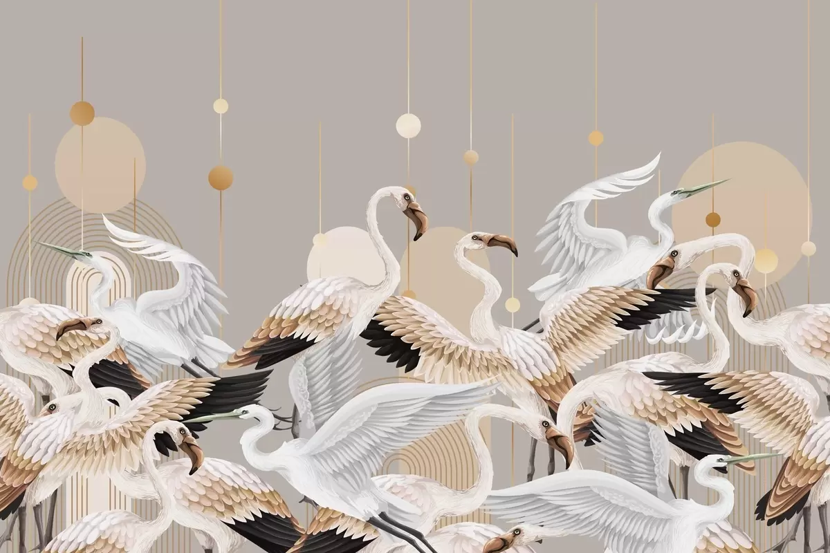 Fototapetai Baltojo flamingo pulkas su subtiliais sparnais, neutralaus fono su geltonomis linijomis ir apskritimais Nr. w09546v1