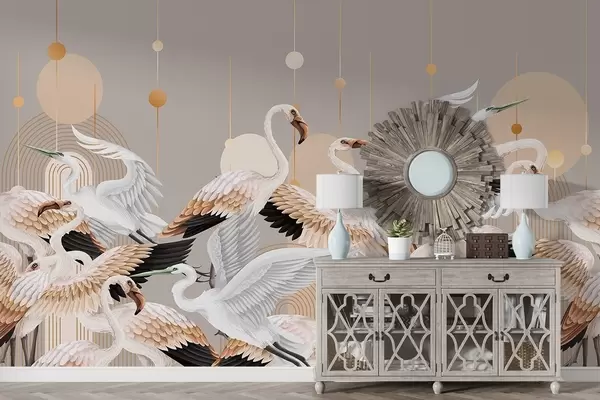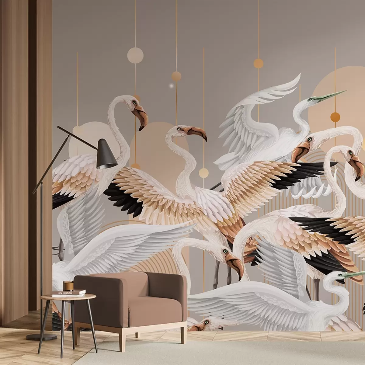 Fototapetai Baltojo flamingo pulkas su subtiliais sparnais, neutralaus fono su geltonomis linijomis ir apskritimais Nr. w09546v1