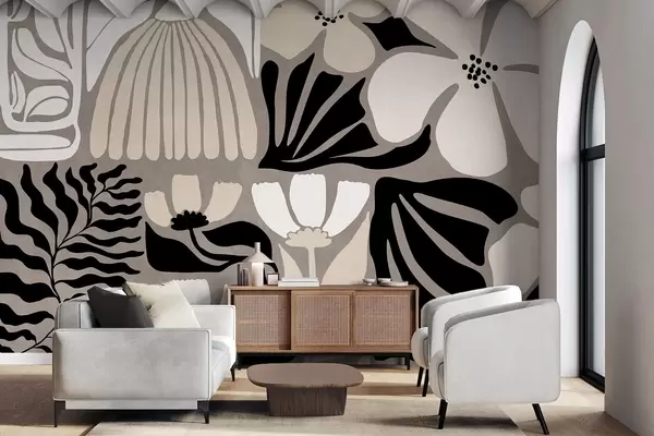 Fototapetai Šiuolaikiškos minimalistinės stilizuotos gėlės ir lapai smėlio, juodos ir baltos spalvos, tekstūruoti ant pilko fono Nr. w09547
