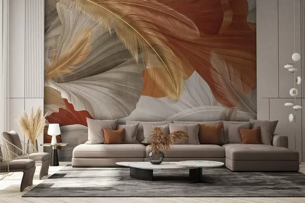 Fototapetai Abstrakčios tekstūros didelės plaukiojančios formos kreminės ir rūdžių spalvos su subtiliais geltonais, smėlio ir rudos spalvos plunksnomis Nr. w09549