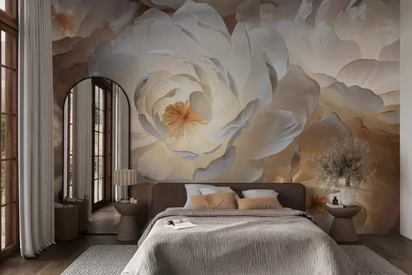 Fototapetai Didelės, baltos fantazijos bijūnų gėlės su geltonomis vidurinėmis dalimis, švelniu apšvietimu ir subtiliais, tekstūruotais sluoksniais išdėstytais žiedlapiais Nr. w09550