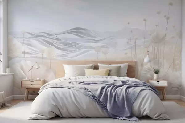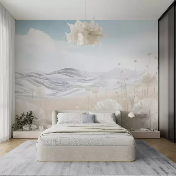 Fototapetai Tekstūruotas kreminių aguonų laukas su banguotais kalnais po šviesiai mėlynu dangumi su švelniais debesimis, pastelinės spalvos Nr. w09553